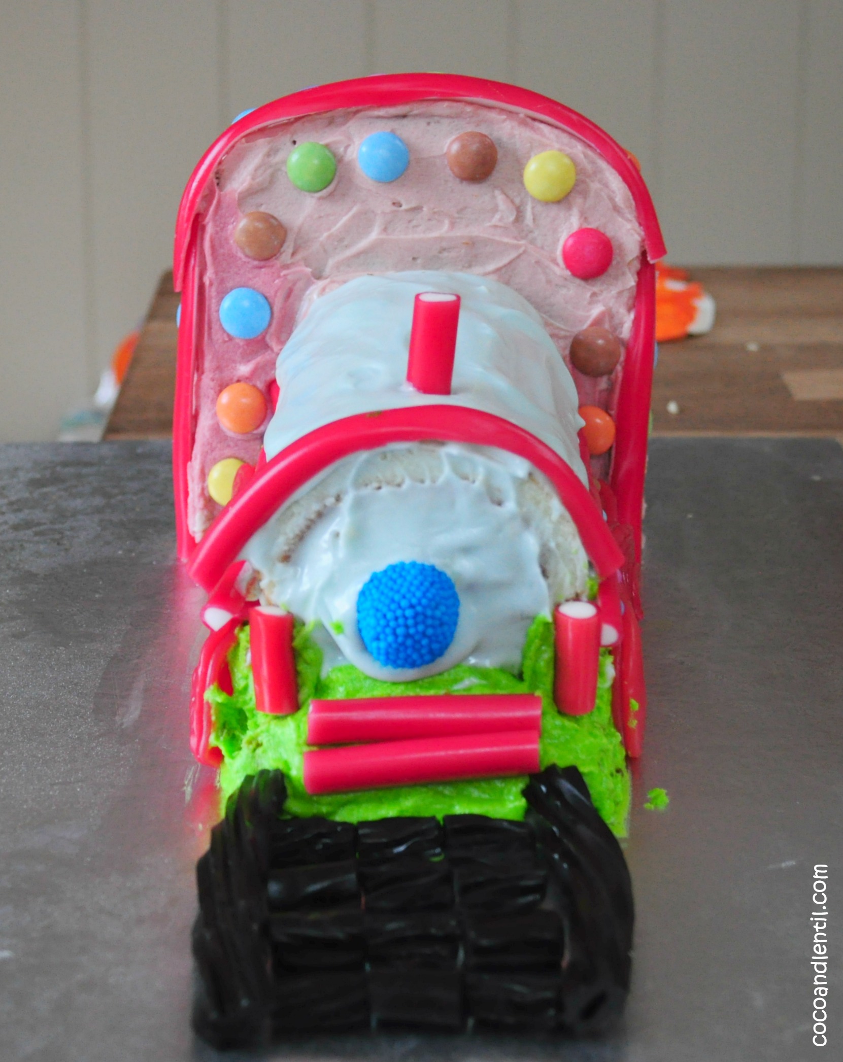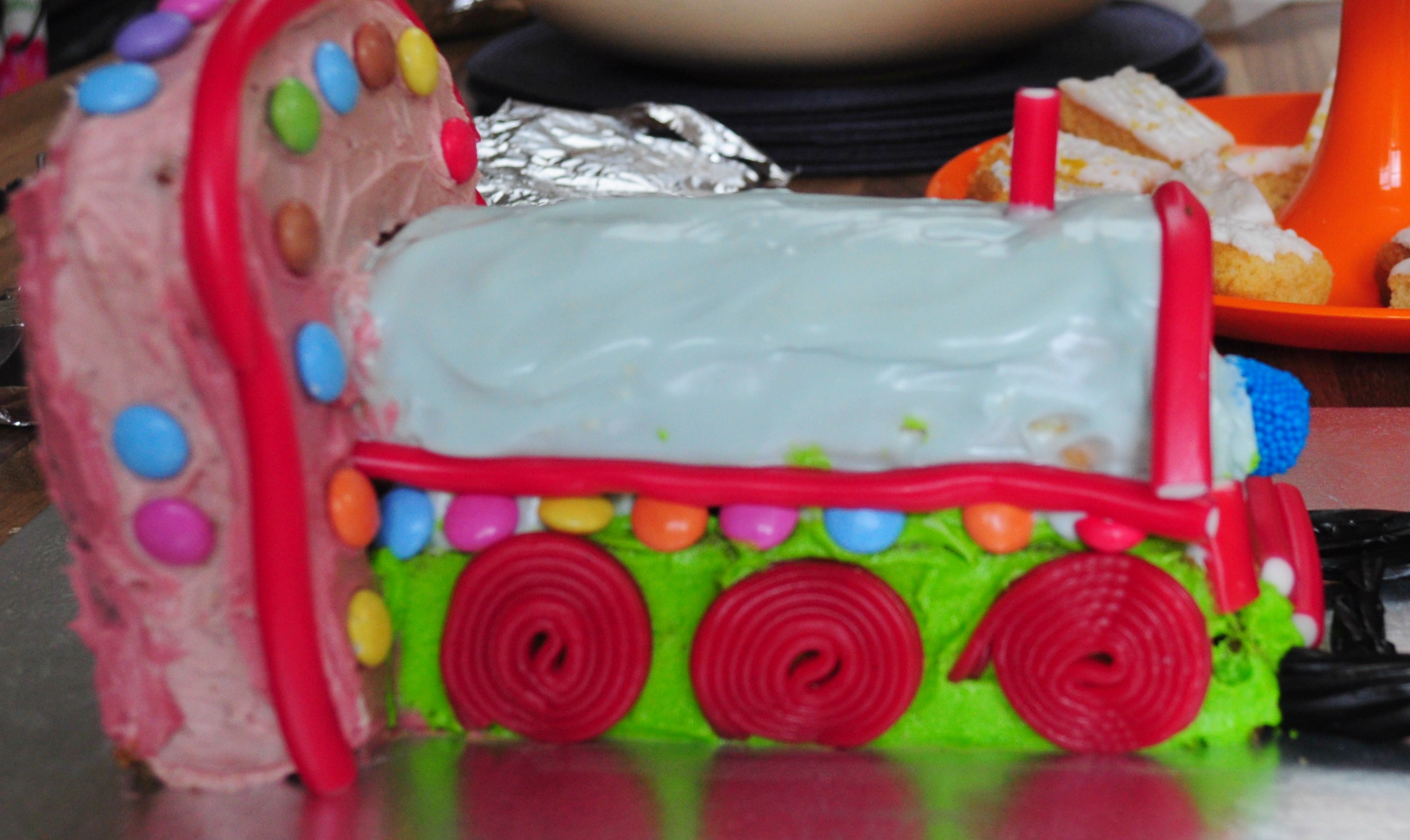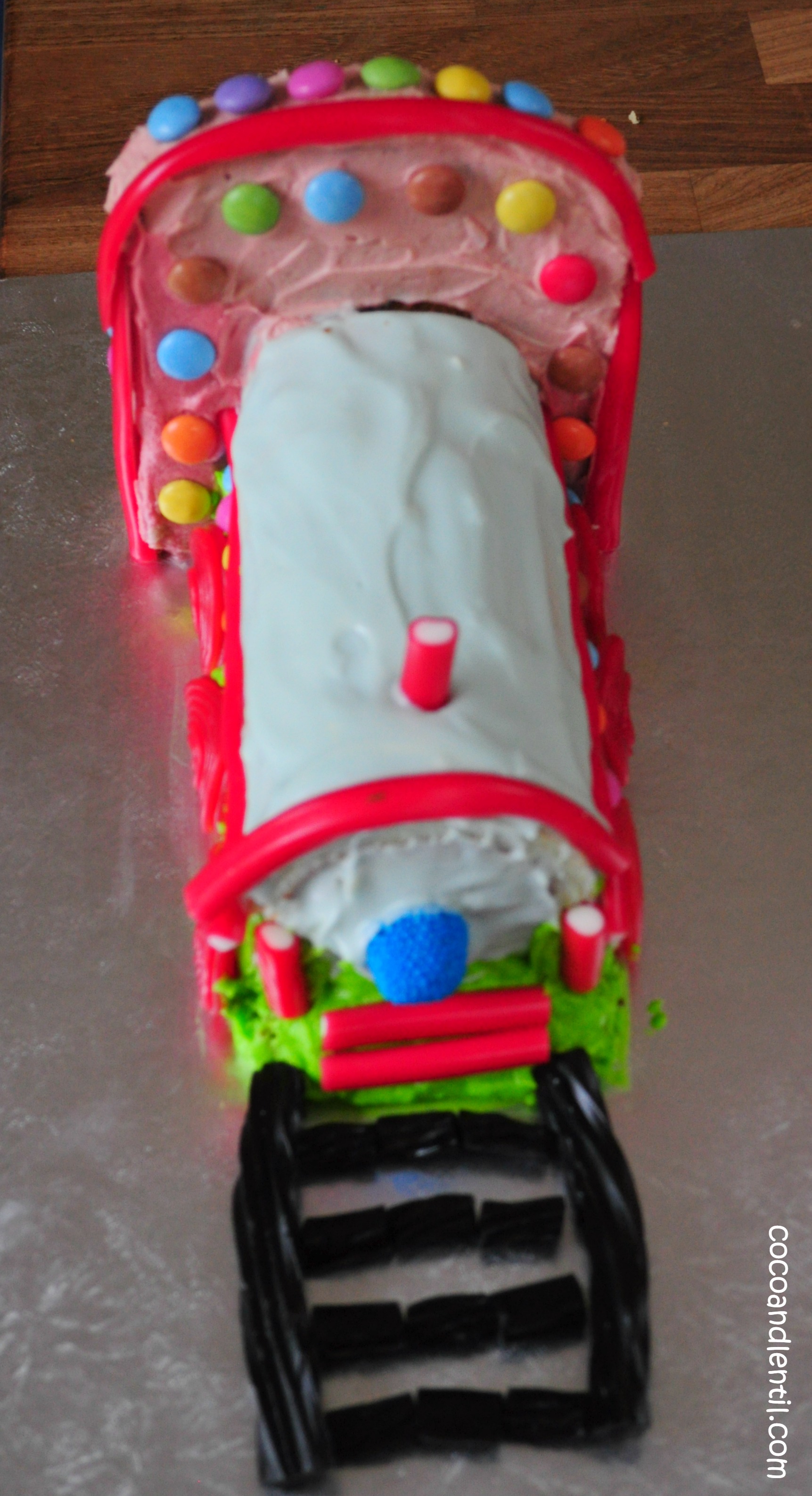 So I borrowed one of Lentil’s trains on which to model my cake. It was supposed to look similar.