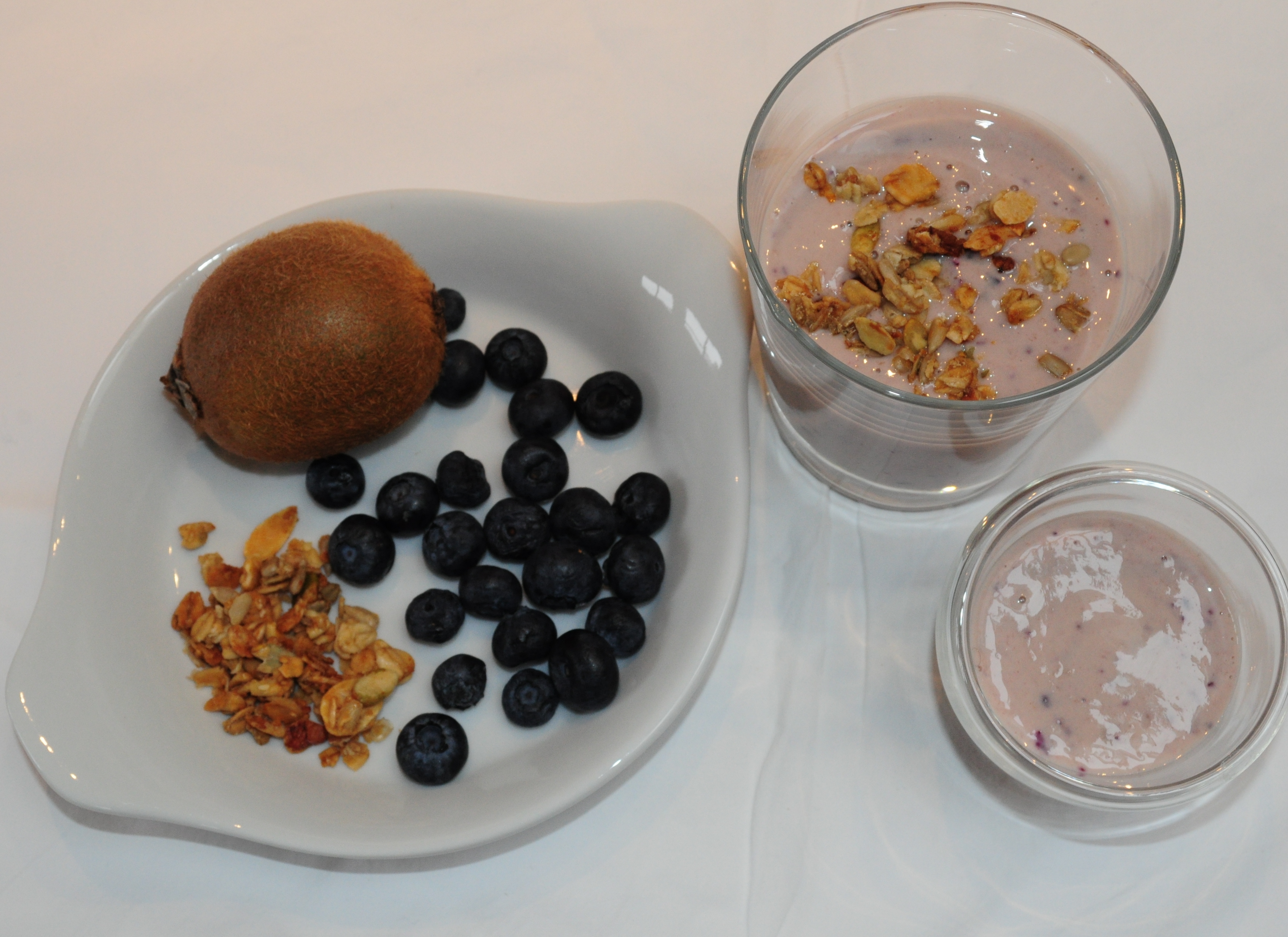 I’m simply hopeless at eating pieces of fruit: I always forget (or go for the biscuit tin instead!) so I started making smoothies to try to pack in my 5-a-day.  Of course Lentil was fascinated with mummy’s new drink, especially when he saw me sprinkle granola on top, and wanted some too.  Great as a mid-morning snack or dessert for little ones.  This will only take you about 5 minutes too!