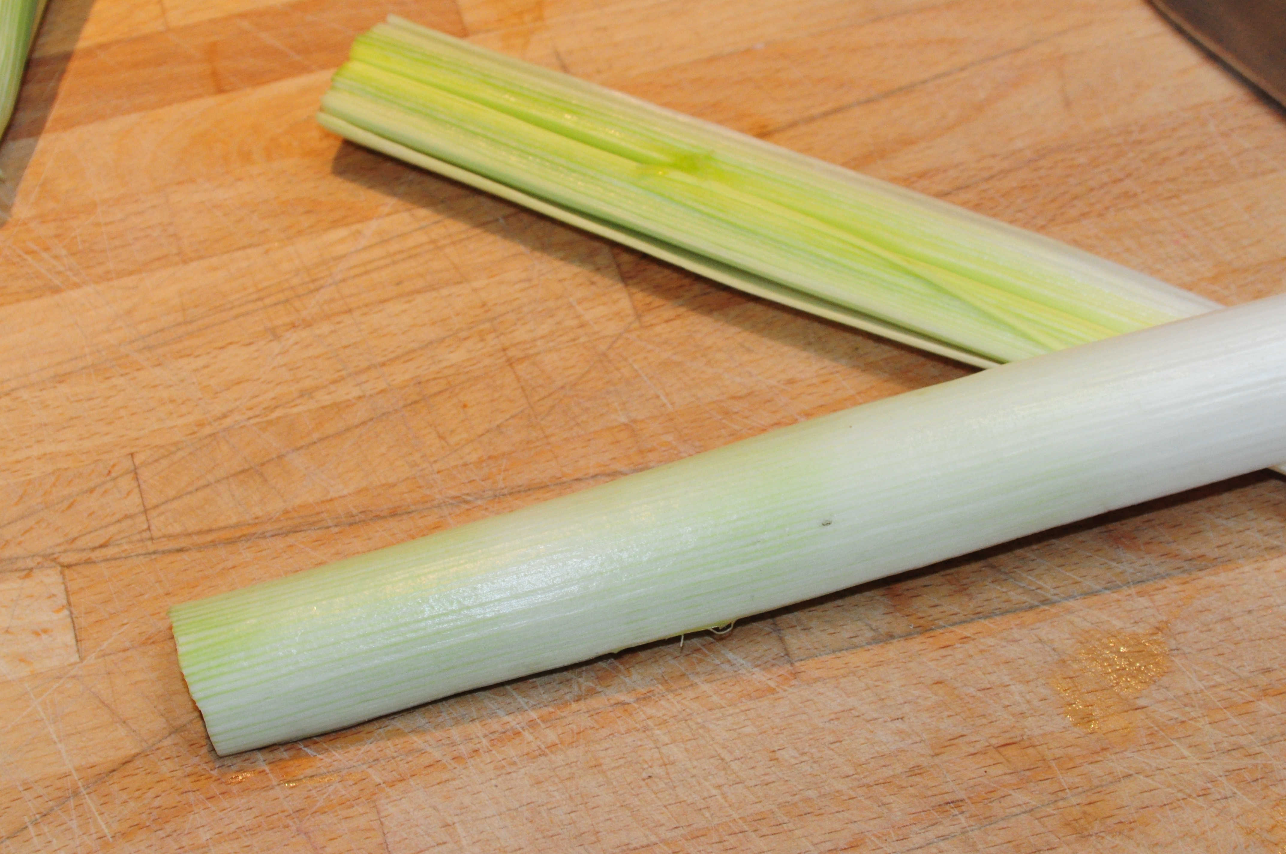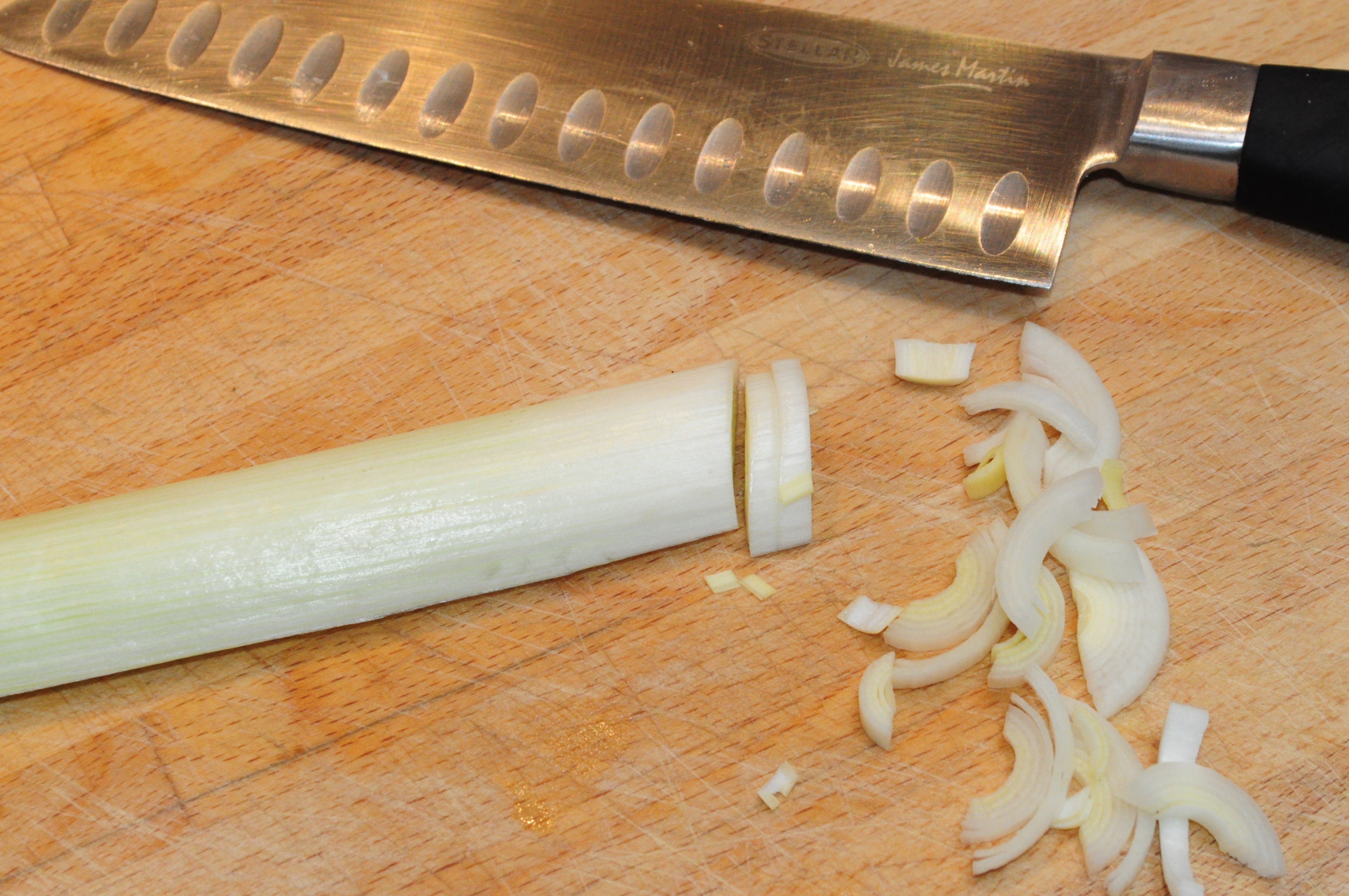 Tip: to make the leek easier to slice, cut it in half to form two semi-circular shapes (to avoid it rolling around as you cut) before finely slicing.
