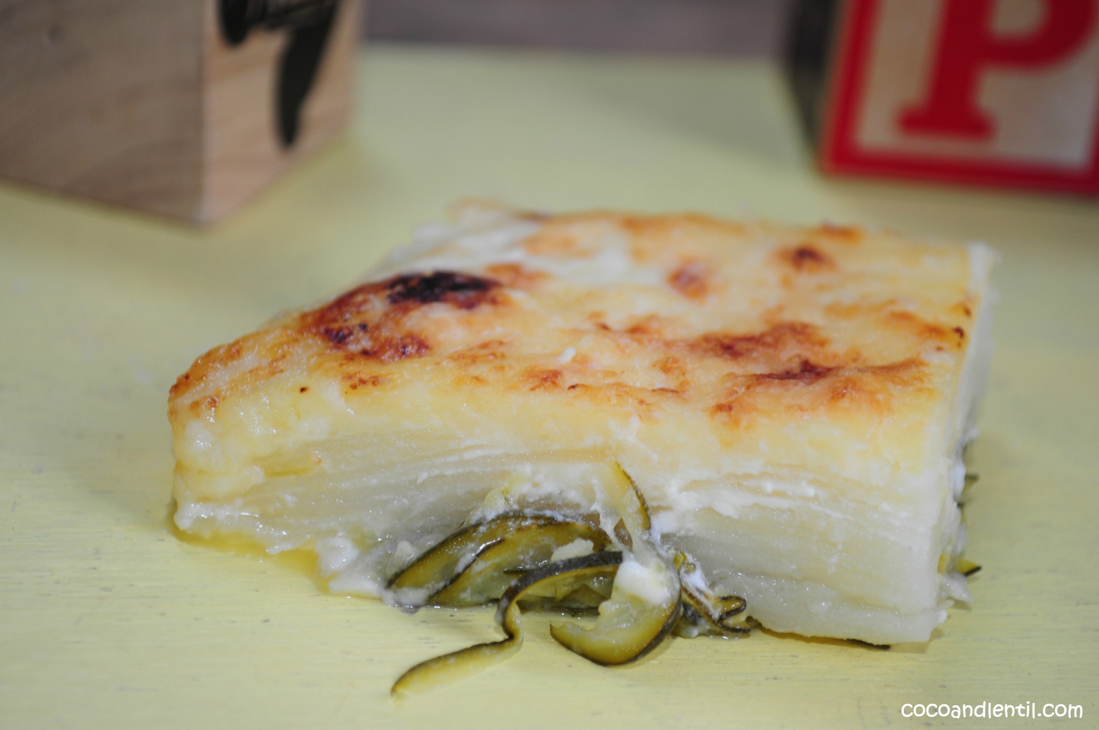 Rub an ovenproof dish with some unsalted butter and empty the onion, leeks and courgette into it.  Next add layers of potato until you have used all of them.  Pour over the sauce and sprinkle with grated cheese.