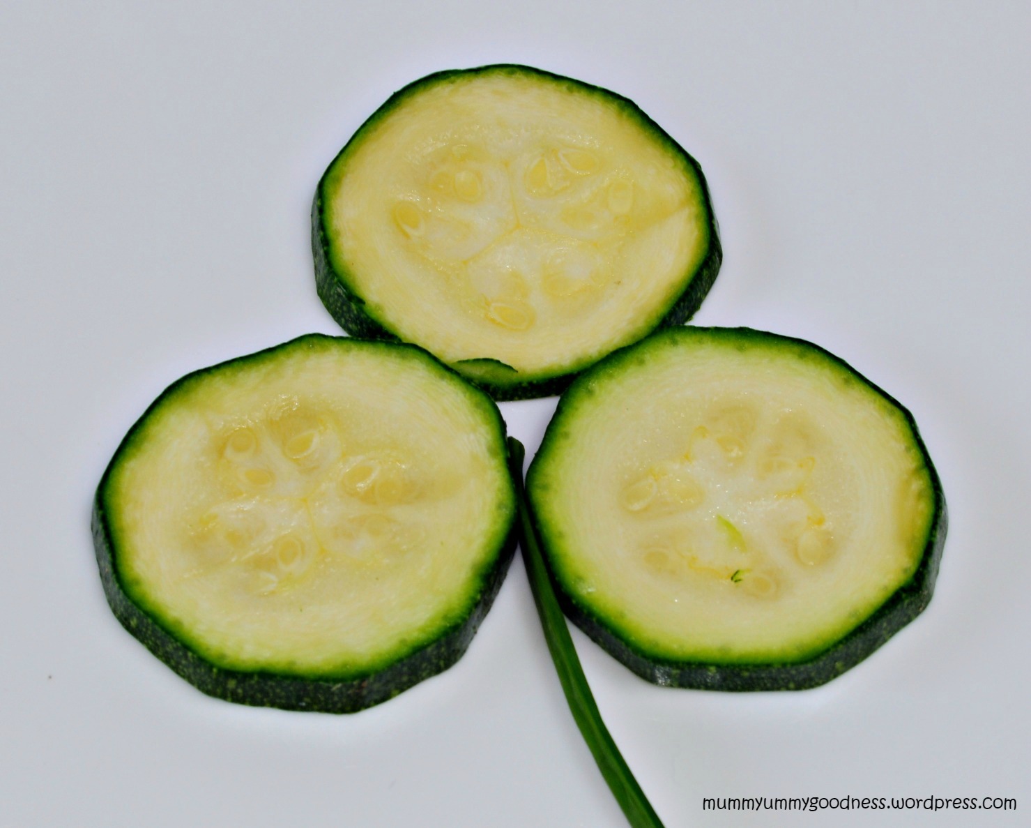 Mummy gives me something that looks like a Shamrock for lunch. Mummy says the green stuff is called courgette.