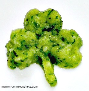 When I made the spinach and potato purée, I was a little eager (or just completely sleep deprived) and threw all the spinach into the potato at once.  The result was a very, very green purée, which I doubted my daughter would find appetising.  Oh well, it was too late.  I’d used all the potatoes.  To my surprise, it really didn’t taste bad at all and Coco wolfed it down.  The green colour simple masked the amount of potato that was actually in the purée.
