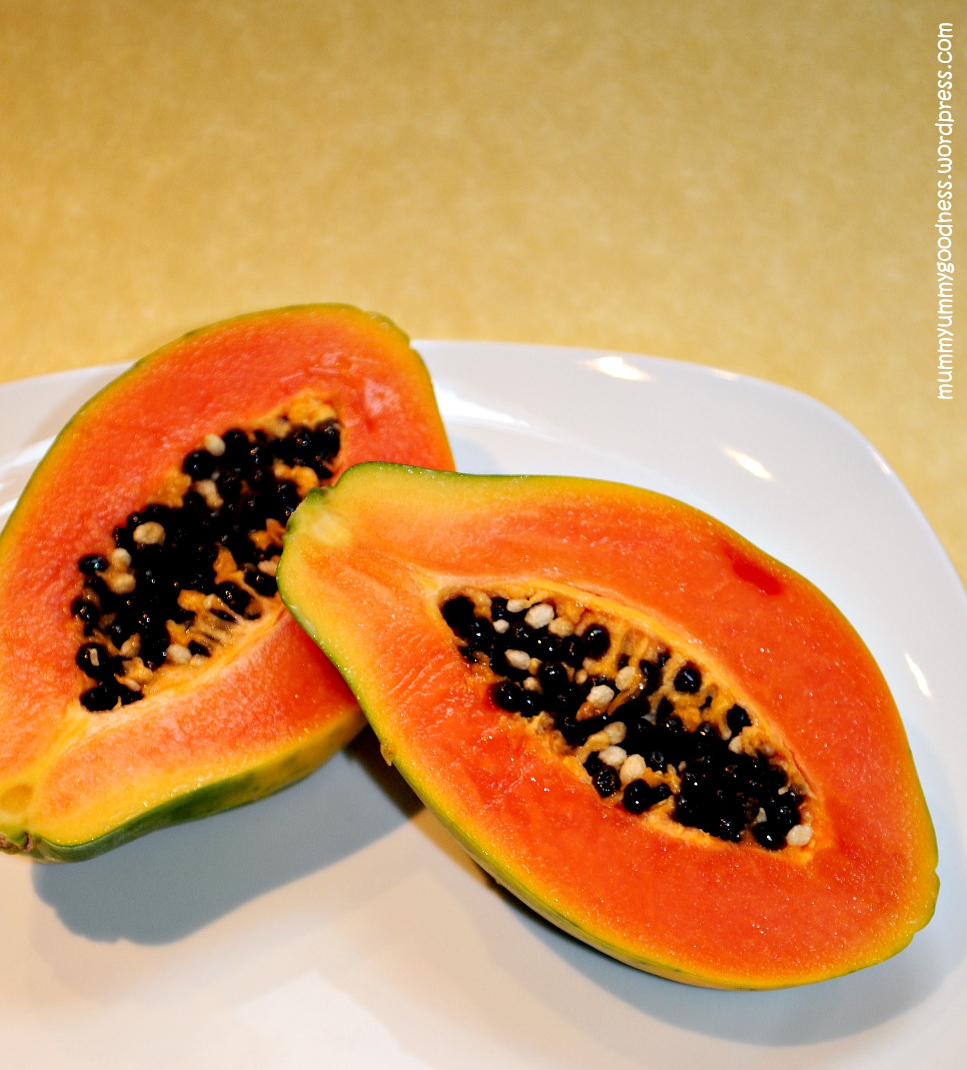 Today Mummy gives me something she calls “papaya”. She says it’s a lovely fruit from the Carica tropical fruit tree.  I wonder if that’s one of the trees in our garden that Papa likes to show me with the birds on it that say “tweet, tweet”?? I’m not so sure about eating things from trees though….