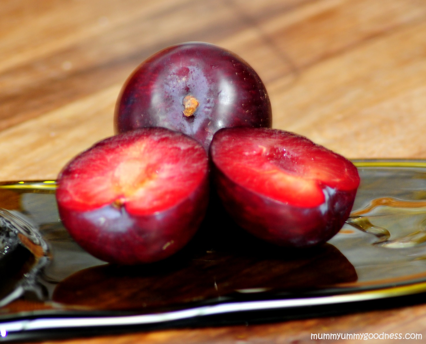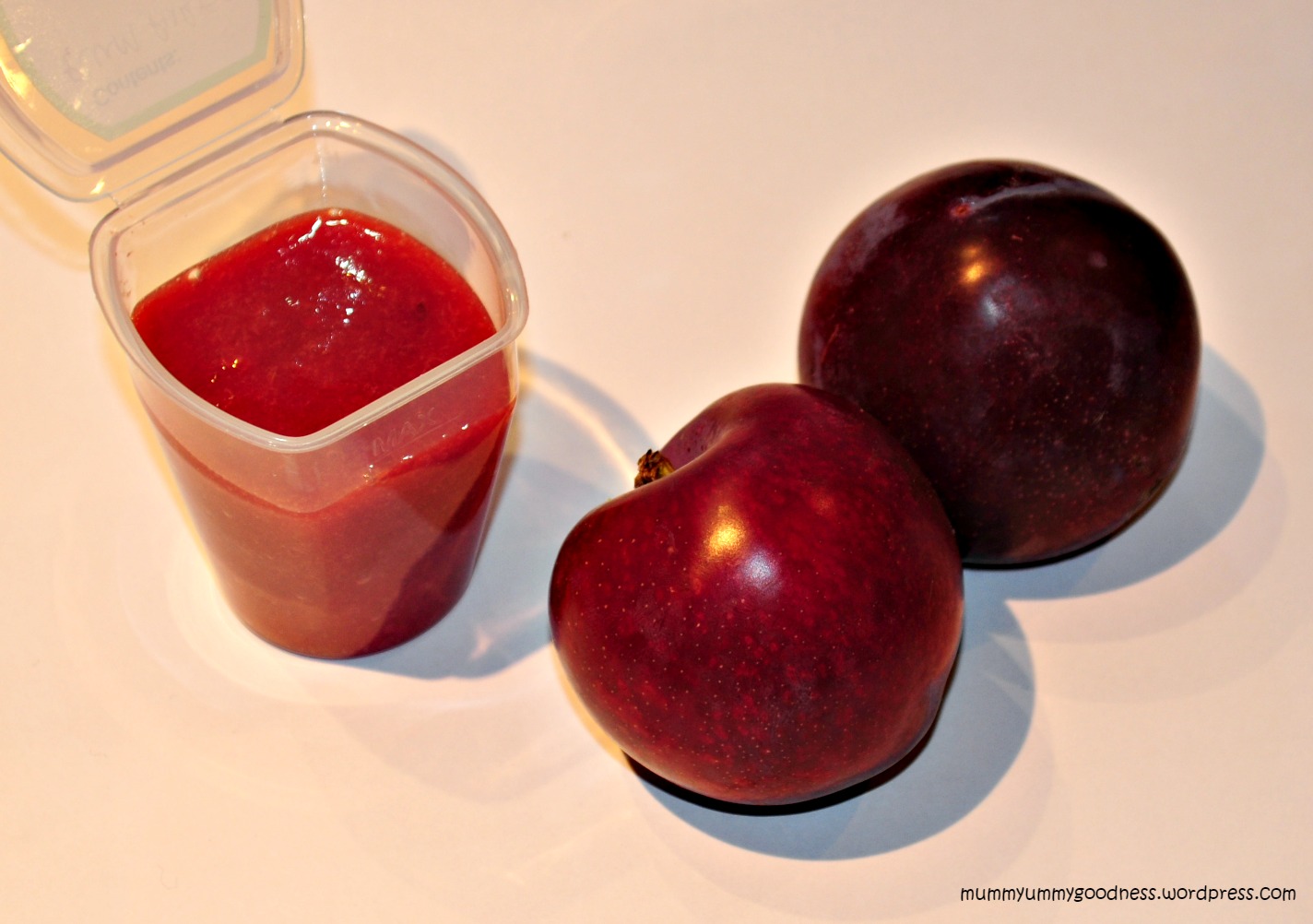 Bring some water to the boil in a large sauce pan.  Place 3 plums in the boiling water until the skin starts to split (about 3 minutes).  Remove the plums with a slotted spoon and place in a bowl of cold water.  This should make the skin easy to remove.  Cut the plums in half to remove the stone and then chop and blitz with a hand-held blender.