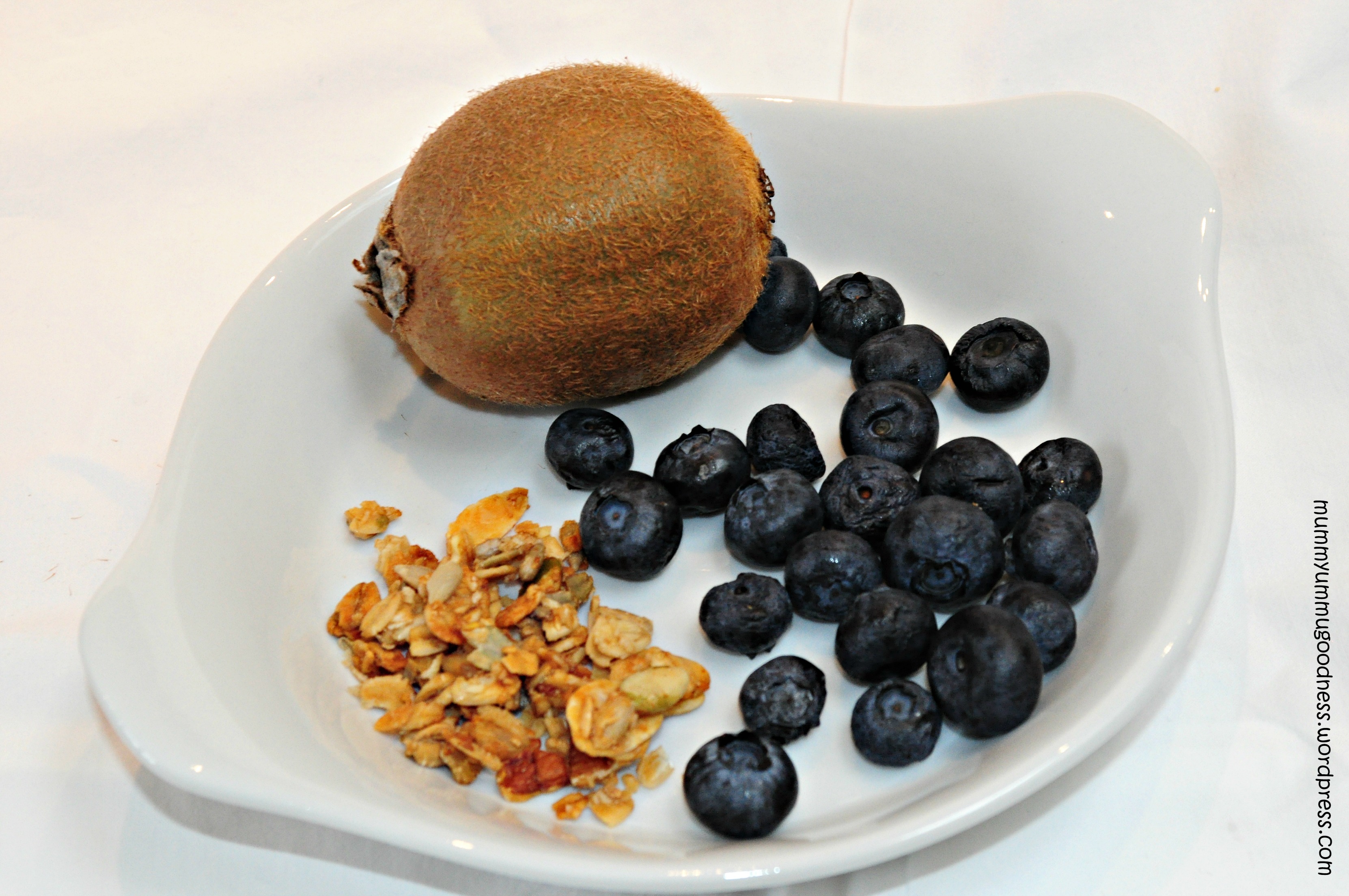 Blend the blueberries, banana and kiwi using a blender (a hand-held one will do). Next add the yoghurt and vanilla and blend again until you have a smooth liquid. Poor into a glass and sprinkle with granola.