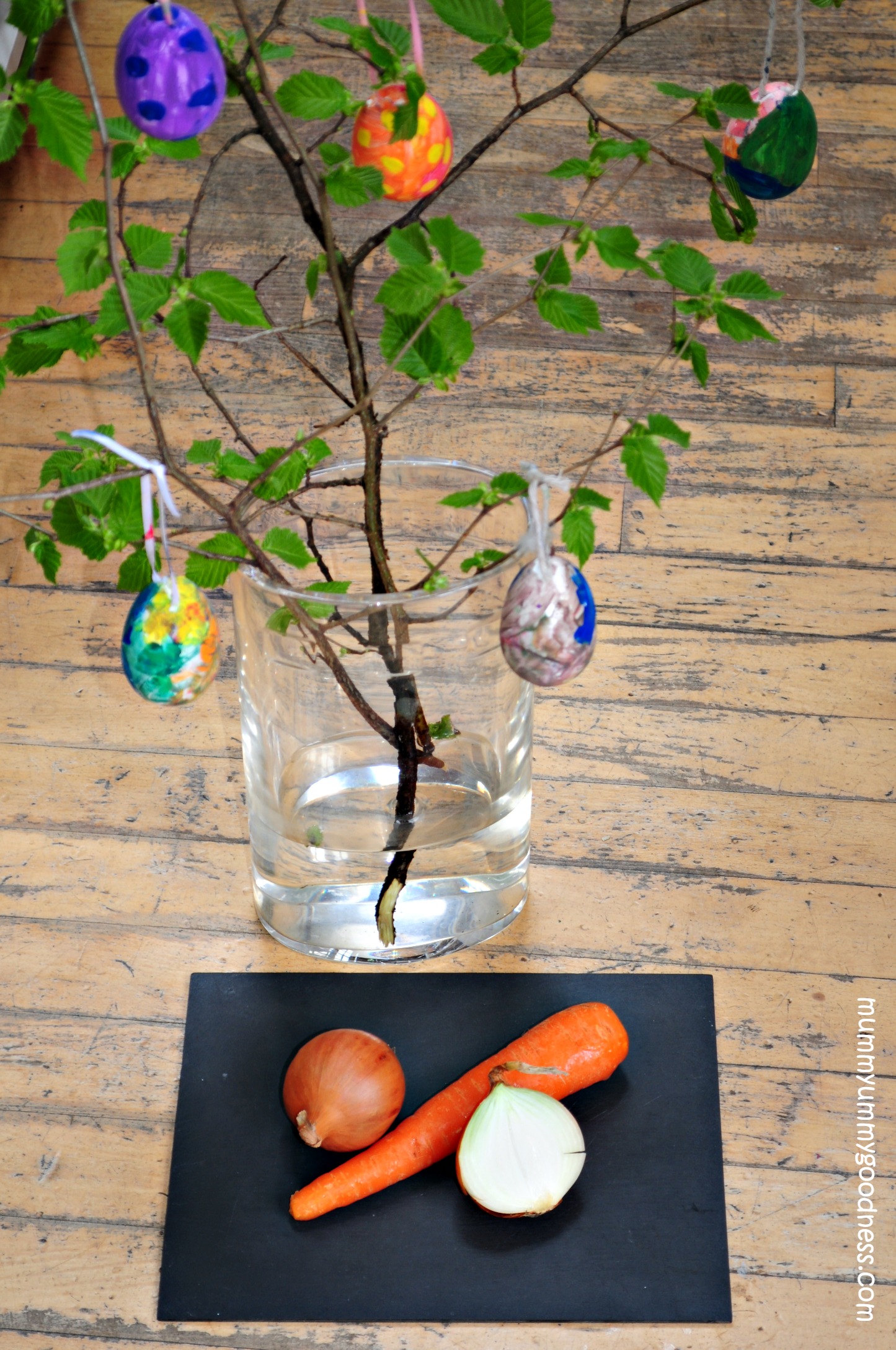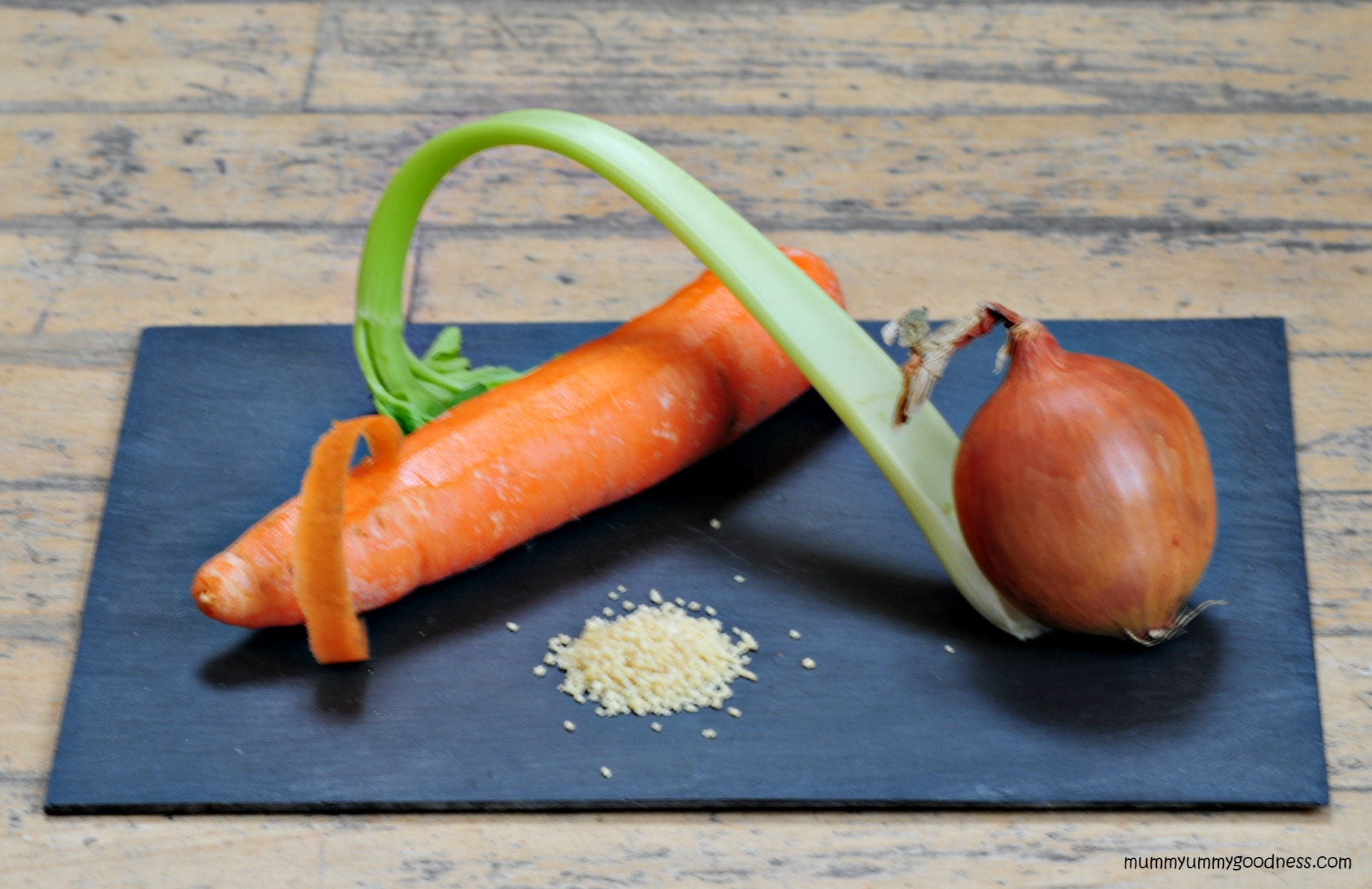 1/2 onion, finely sliced and 3 carrots, peeled and chopped.