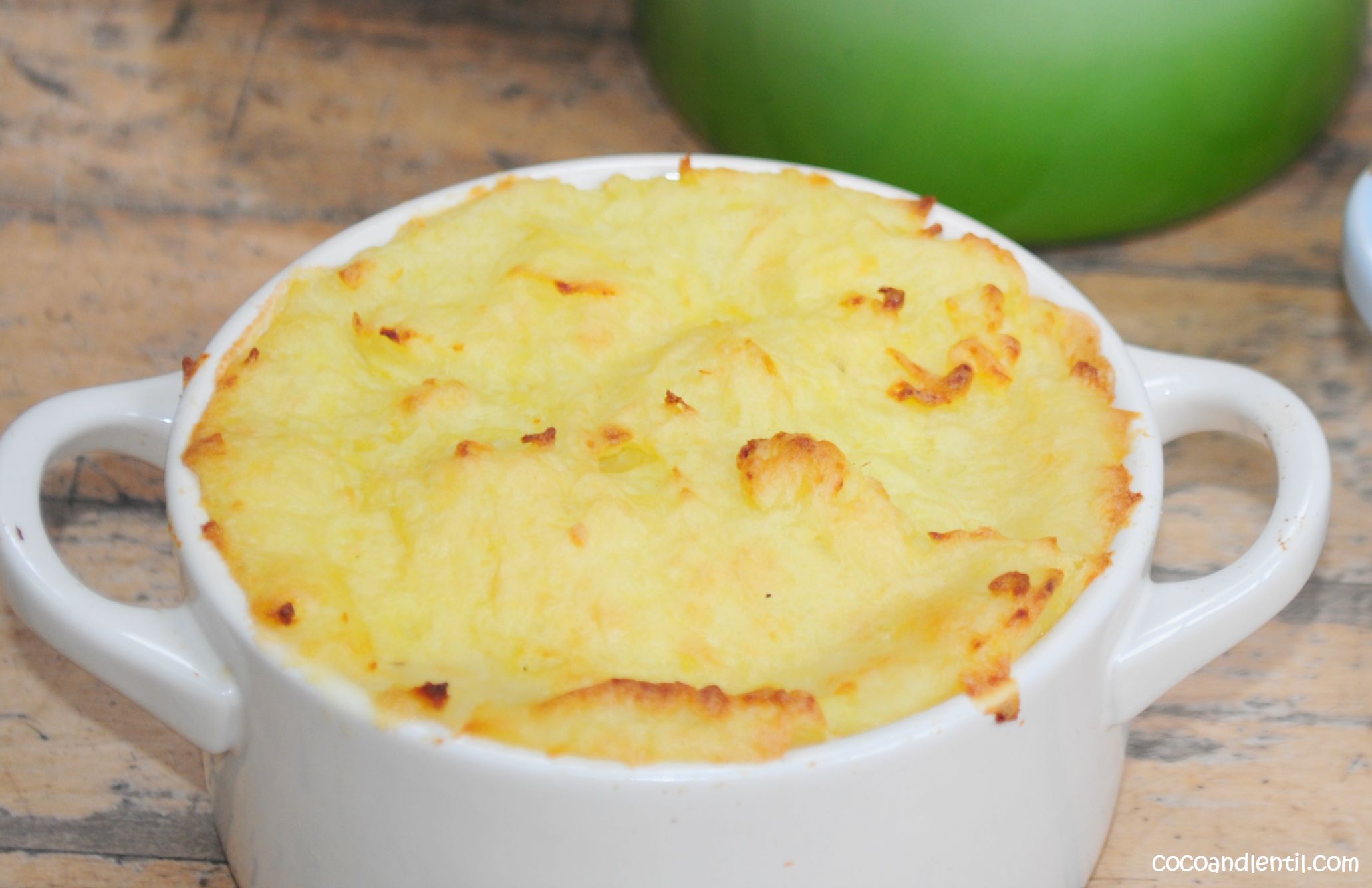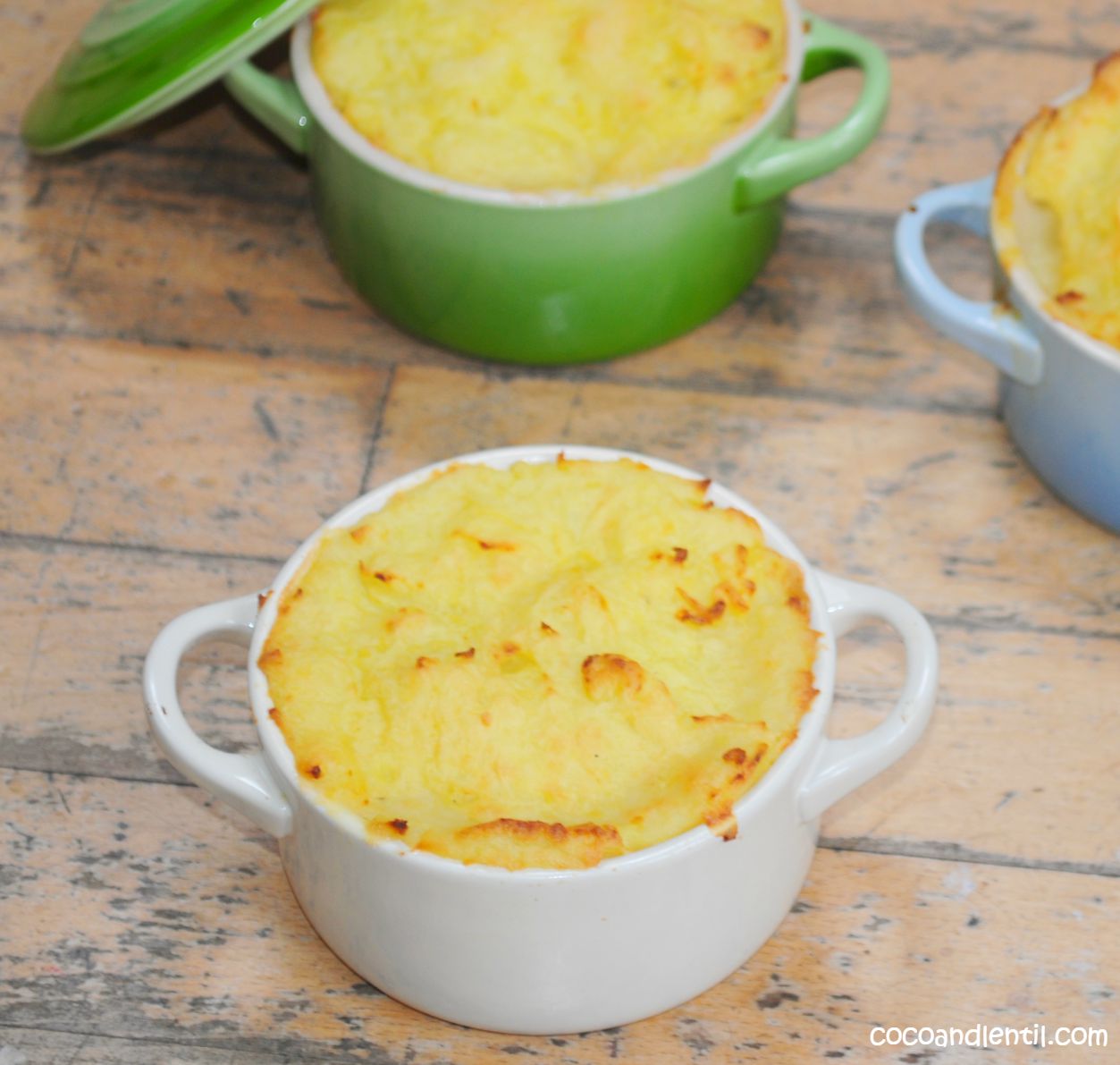 To prepare the pies fill each ramekin with a layer of spring onions, tomato, fish (mix the salmon and white fish), peas and cheese. Alternatively you can use one larger ovenproof dish. Add a little stock and a squeeze of lemon juice to each ramekin and top with a good few dollops of mashed potato. Brush potato will a little milk and bake in the oven for 20-25 minutes until the potato is a nice golden colour.