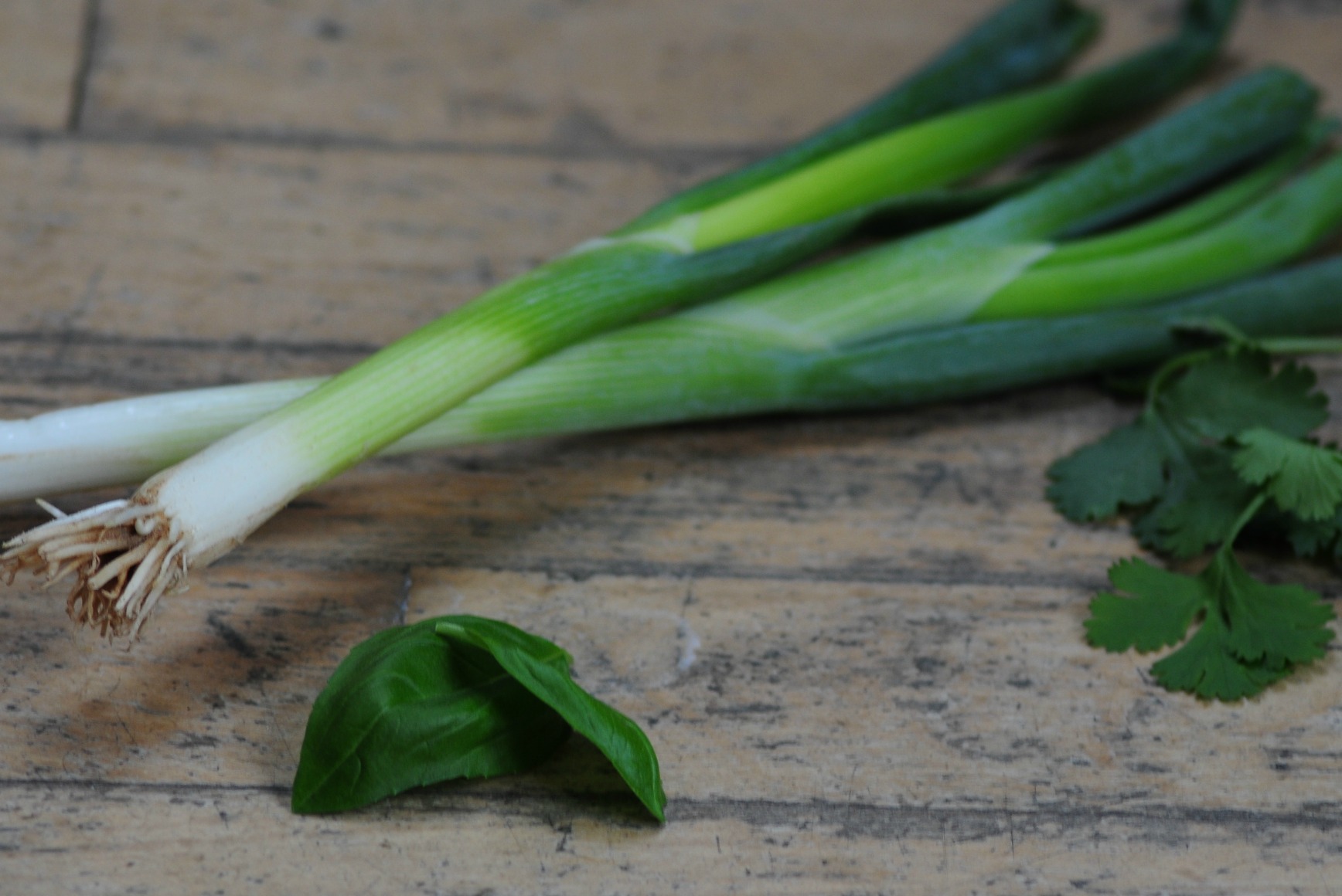 Meanwhile saute the spring onions in a little olive oil, remove, add the bacon to the saute-pan and cook, turning over half way through.  Once cooked, remove any rind from the bacon and dice.