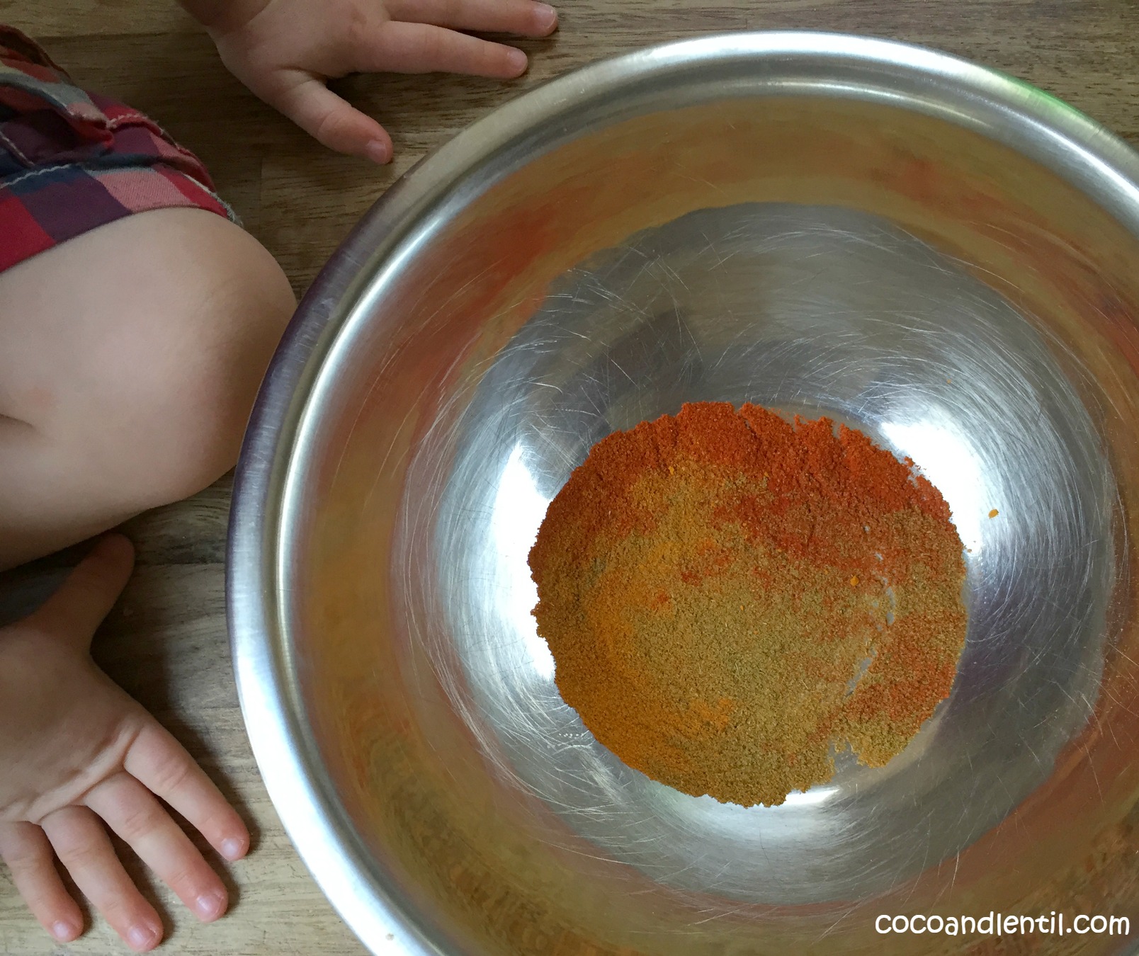 I wanted to introduce Coco and Lentil to some gentle curry flavours and spices without creating too complex or piquant a first dish.  As this recipe is really easy and quick to make it’s perfect for a midweek dinner.  The mango chutney adds a refreshing element.