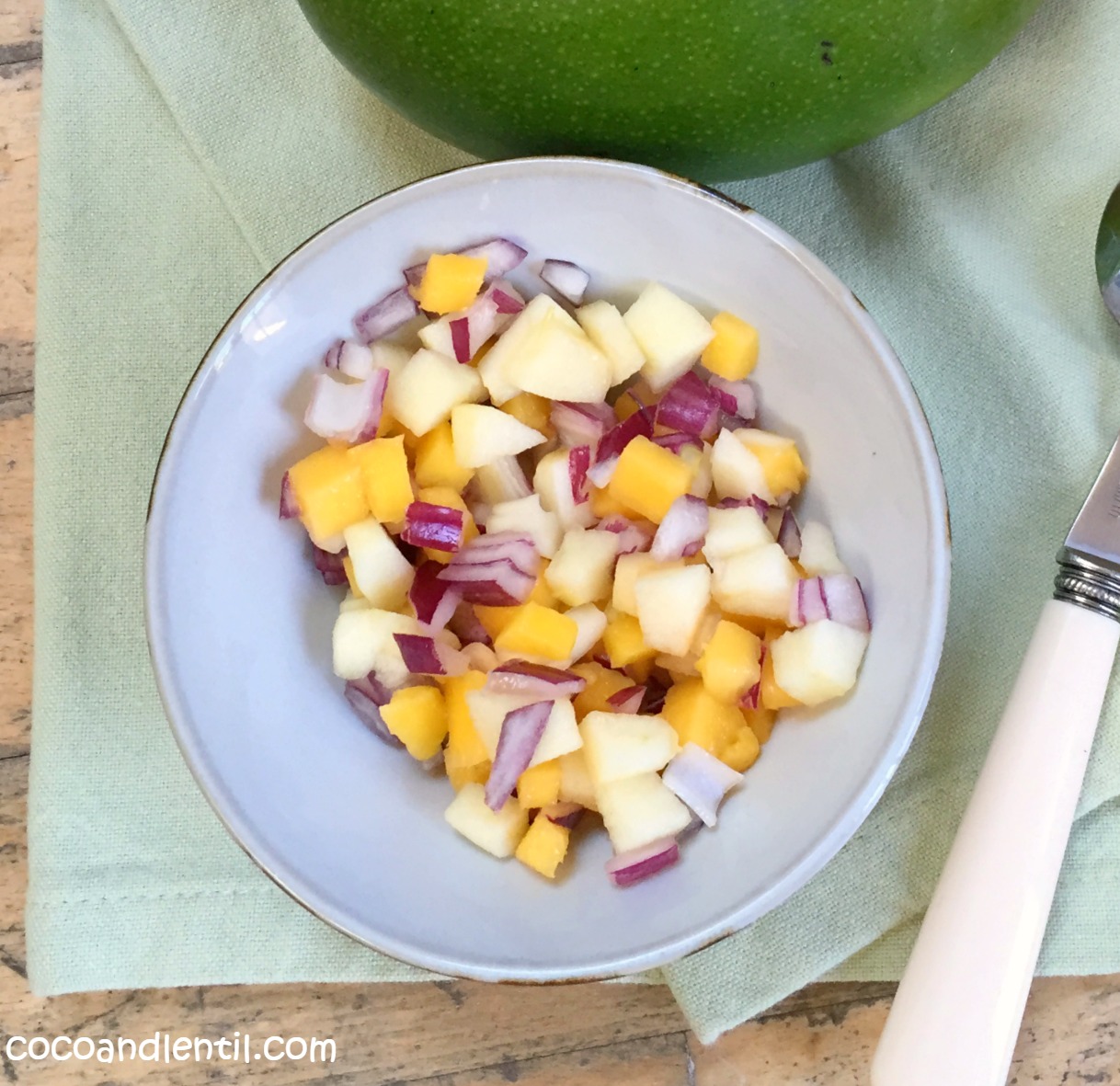 To make the chutney, simply add all the ingredients to a bowl and mix well.  Cover and place in the fridge until needed.